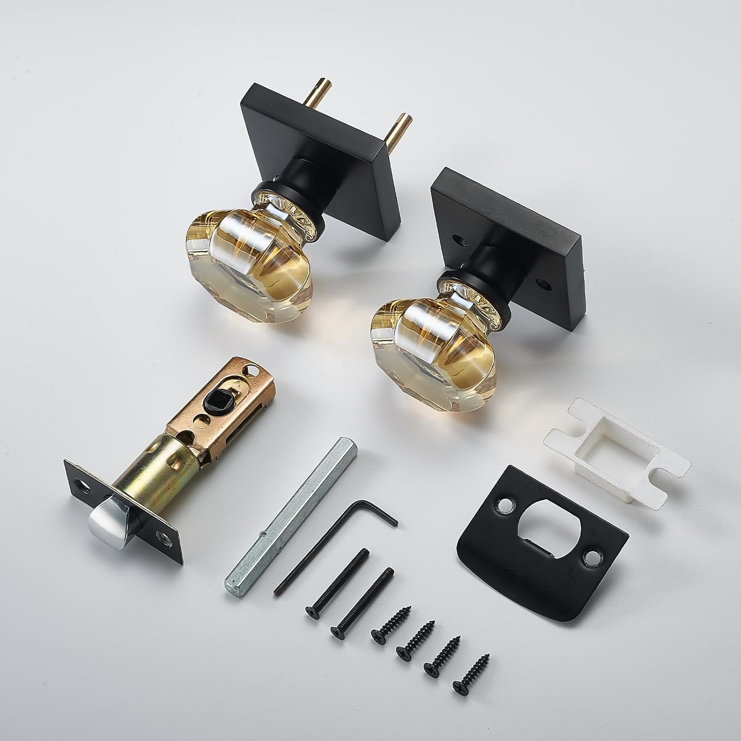 Champagne Gold Glass Passage Door Knob – Non-Locking Interior Crystal Handle with Matte Black Square Rosette – Elegant Octagonal Style for Hallway, Closet, Kids Room
