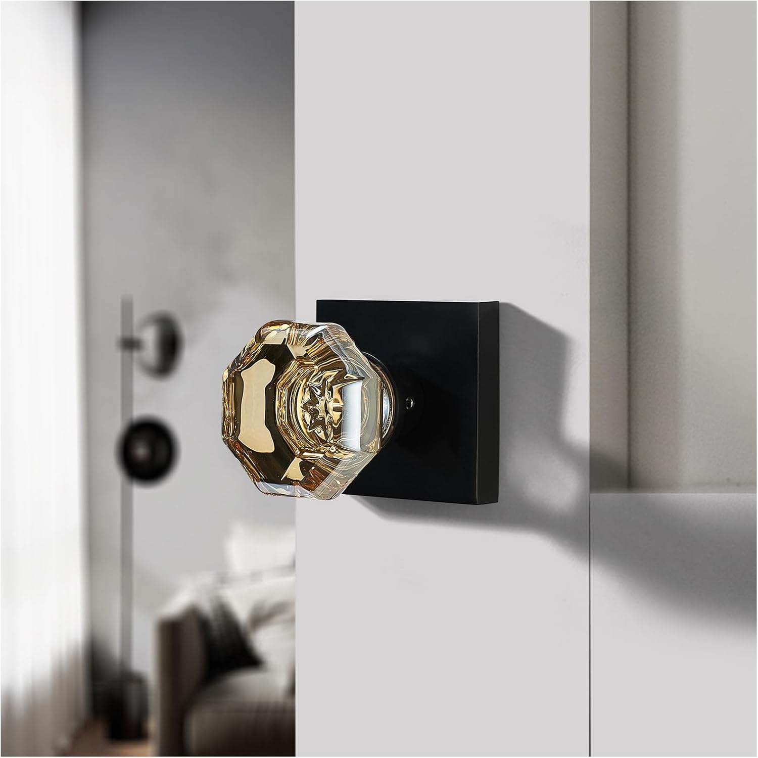 hampagne Gold Crystal Door Knob with Matte Black Square Rosette – Elegant Octagonal Privacy Handle Set for Bedroom, Bathroom, Closet – Vintage Glass Interior Door Lock for Home Decor